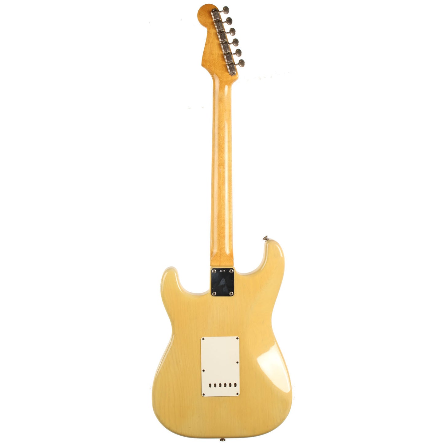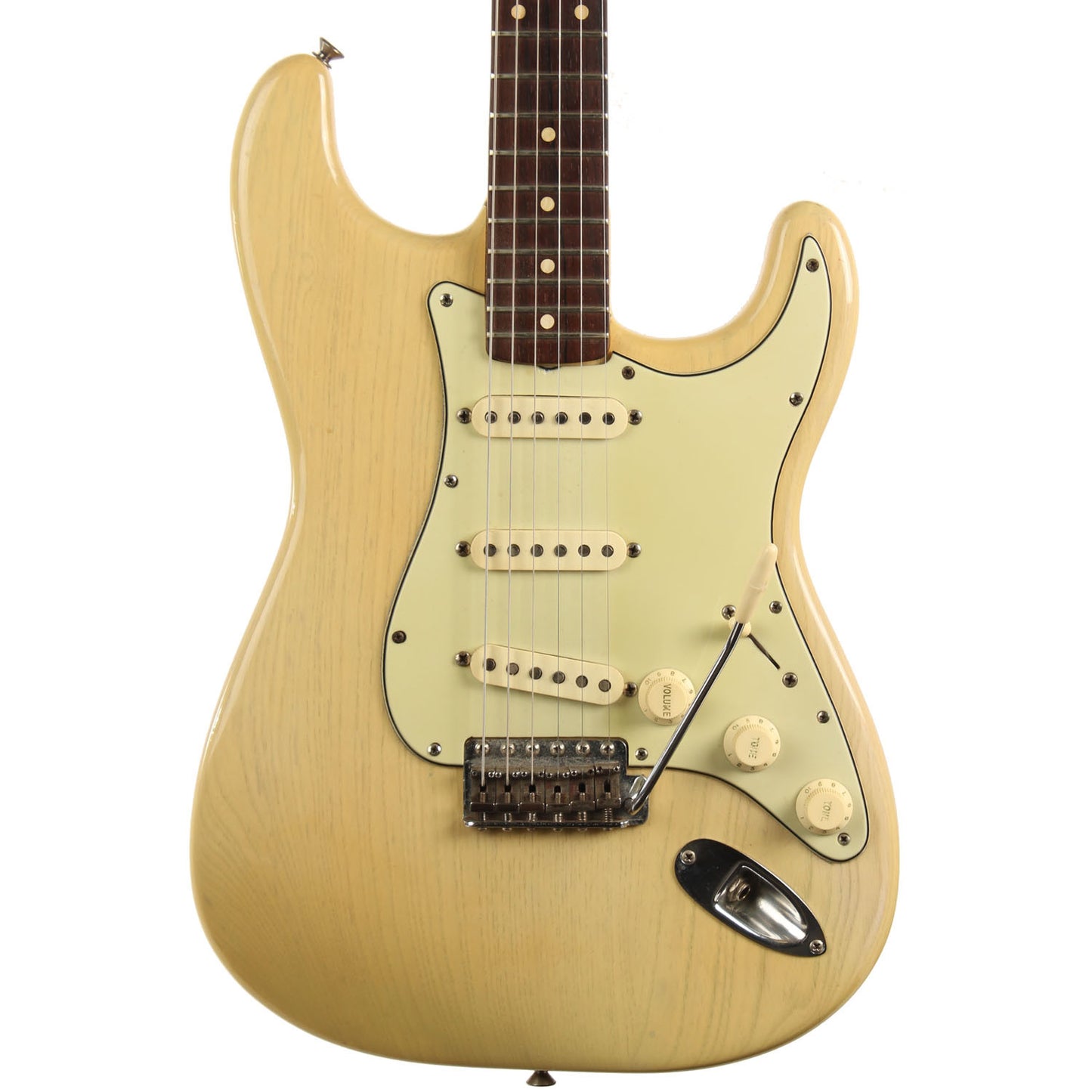 This fantastic vintage Stratocaster was just purchased from a studio. It has been refretted and both the body and neck have been refinished in Nitro Cellulose lacquer. The decal was also replaced when the neck was refinished. It plays amazingly and sound superb. Comes with original tremolo bar and original brown hardshell case.
