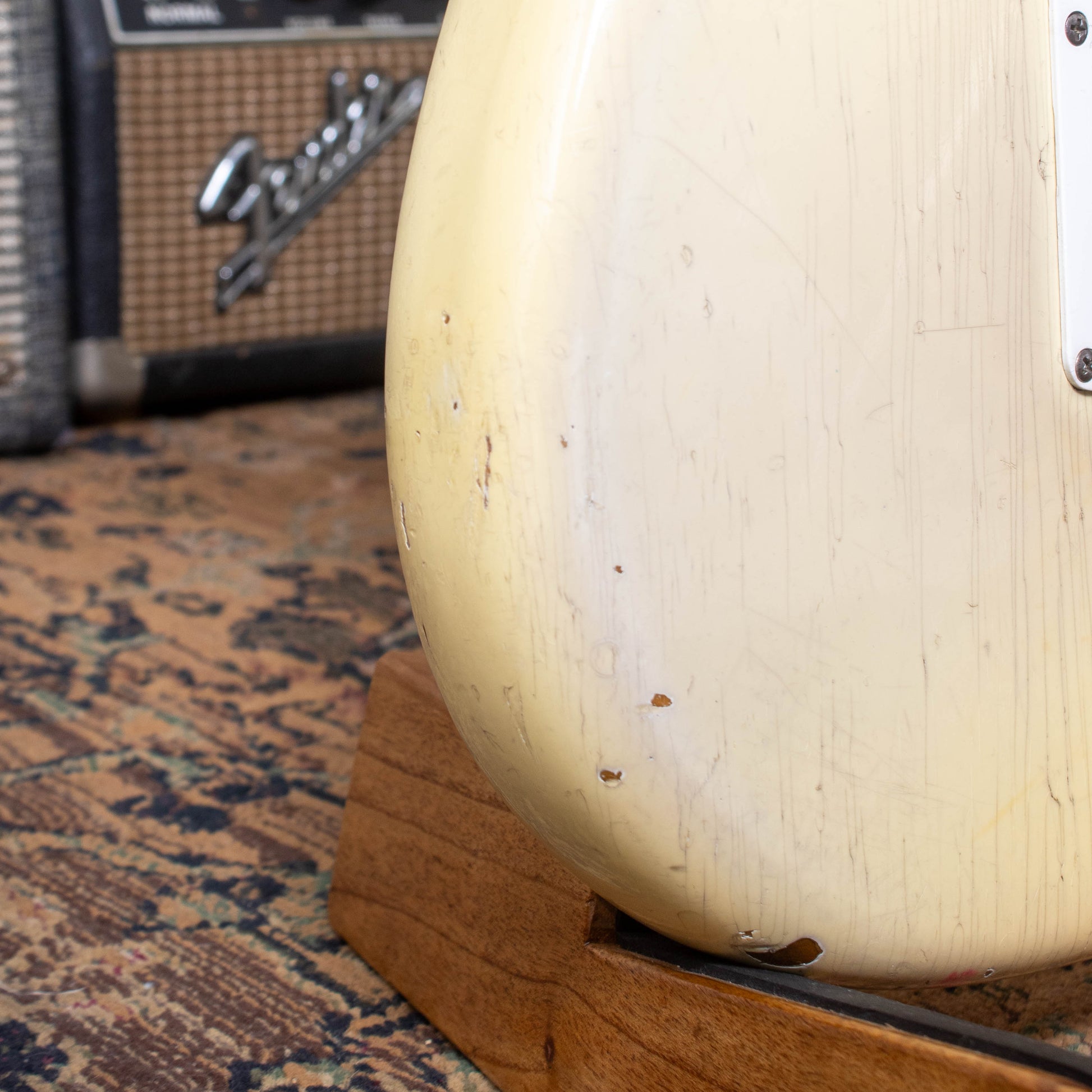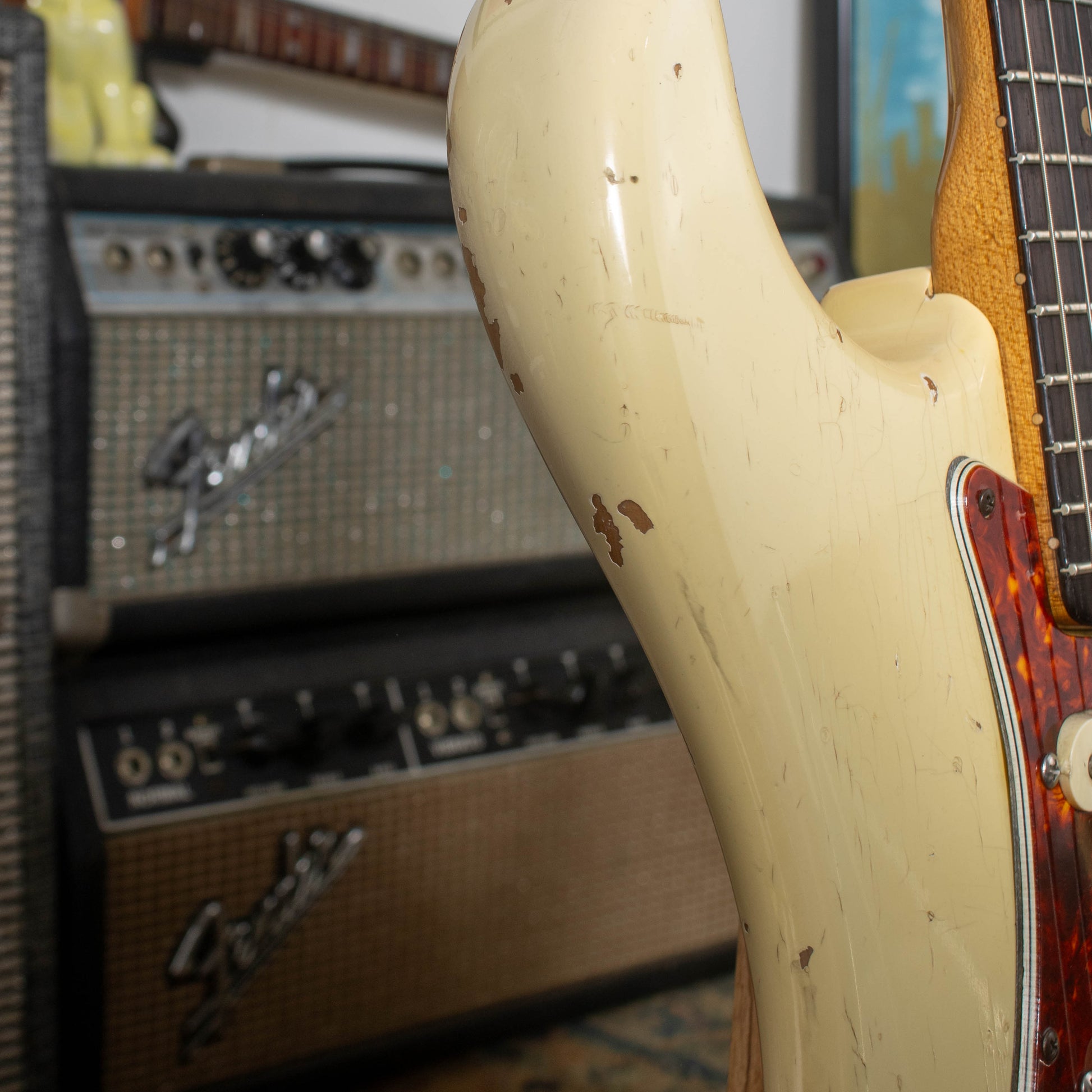 Originally finished in Sunburst, this Strat was returned to Fender in 1965, where it received a factory Olympic White refinish — a custom color that would soon become a defining aesthetic of ’60s Fenders. Evidence of its unique history remains visible beneath the surface: “SO White” (for “special order”) is stamped in the body cavity, alongside the marking “6559,” burned in with a soldering iron. Though Fender’s approach to marking factory refins was far from uniform, comparable examples from this period have shown similar identifiers. To complement the new finish, the guitar also received a factory tortoise-shell pickguard. (Please note: only the body was refinished; the neck retains its original 1963 nitro.)