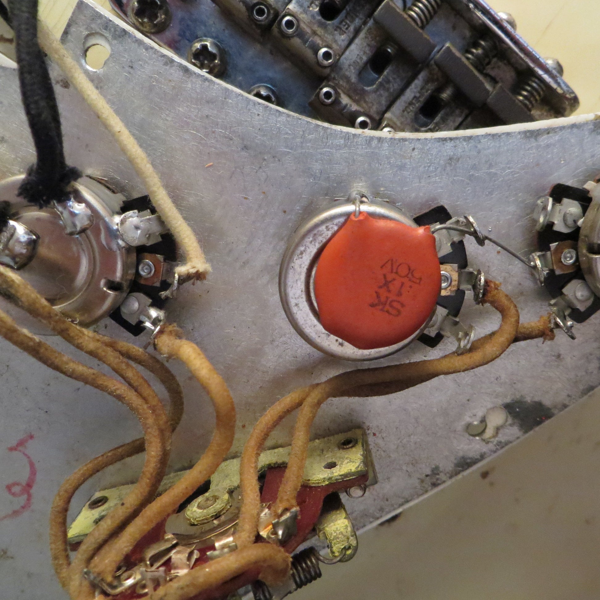 Electronics are original except for the potentiometers, which have been replaced with modern CTS units; 2 of the original Stackpole pots (304-6324) are included. The three original black-bobbin, staggered-pole single-coil pickups have never been rewound. Measuring 6.05k (neck), 6.03k (middle), and 5.92k Ω (bridge), they deliver the chime, snap, and harmonic richness that define early-’60s Strat tone. Although the bridge position cavity shows a shallow aftermarket rout, this modification was made at no expense to the guitar's set-up, playability, or sound. Additionally, a modern 5-way selector is installed for tonal versatility, though the original 3-way CRL 1452 switch accompanies the guitar.