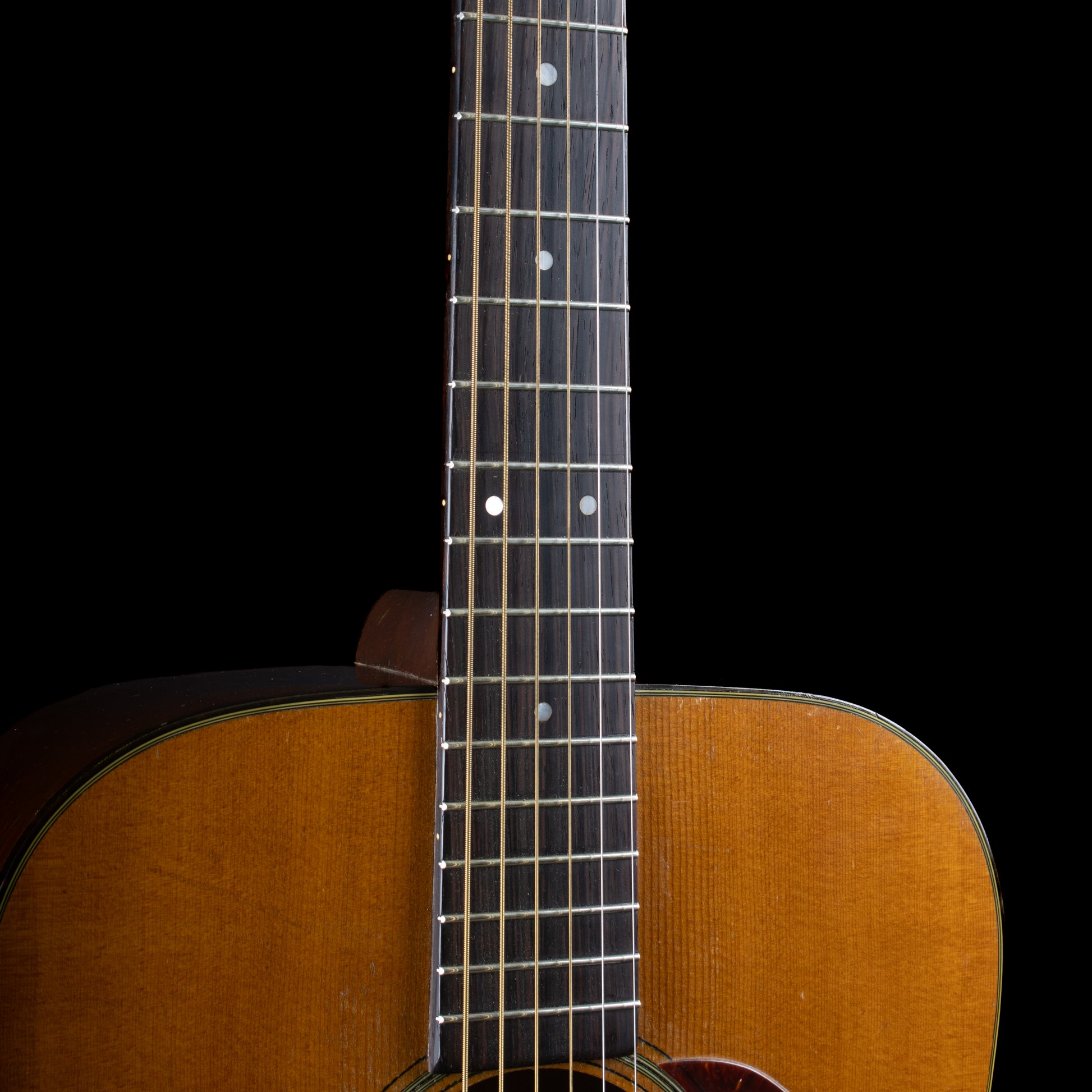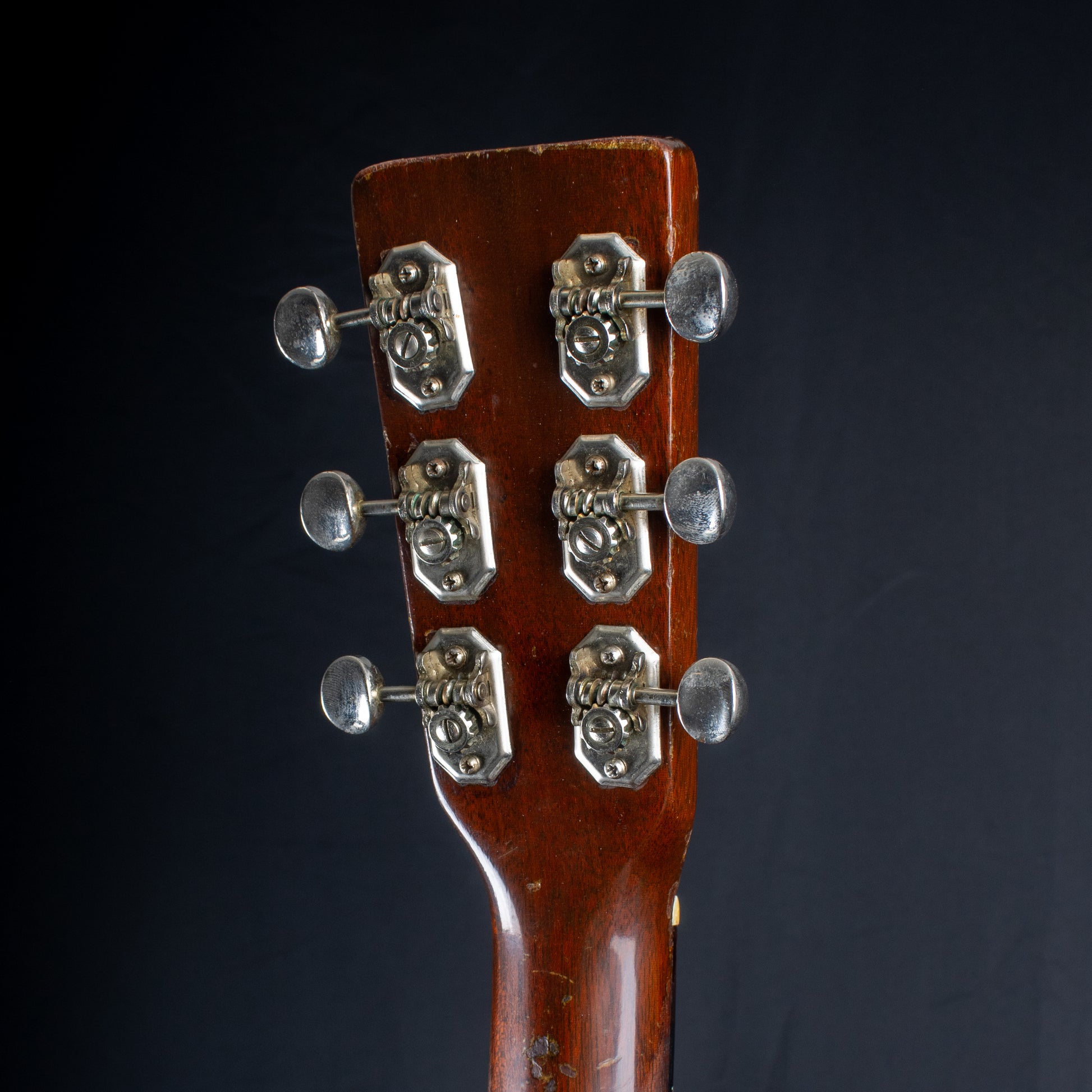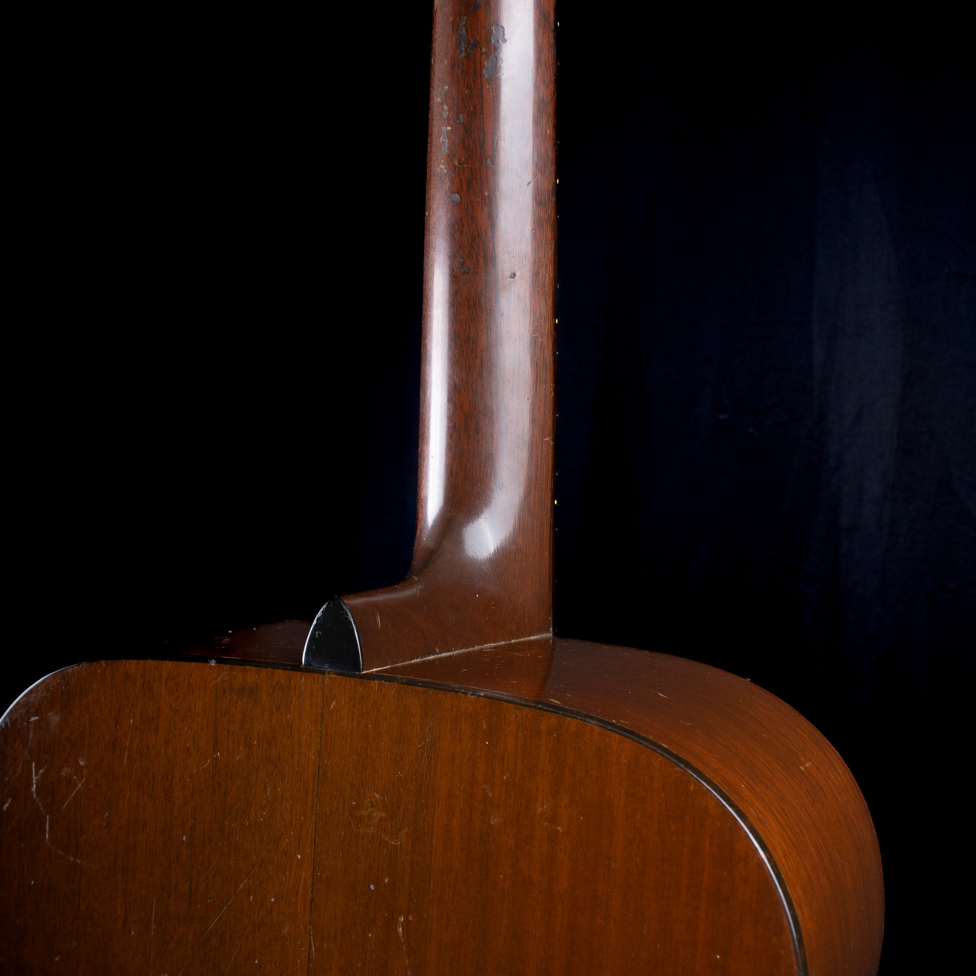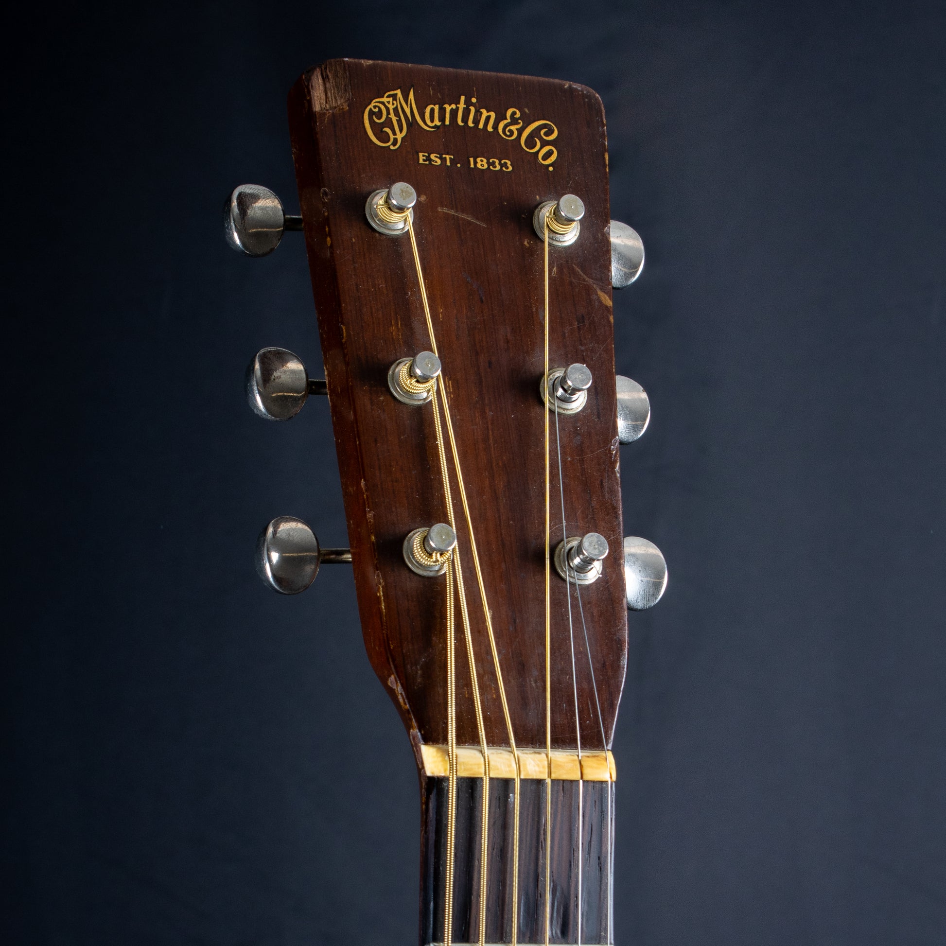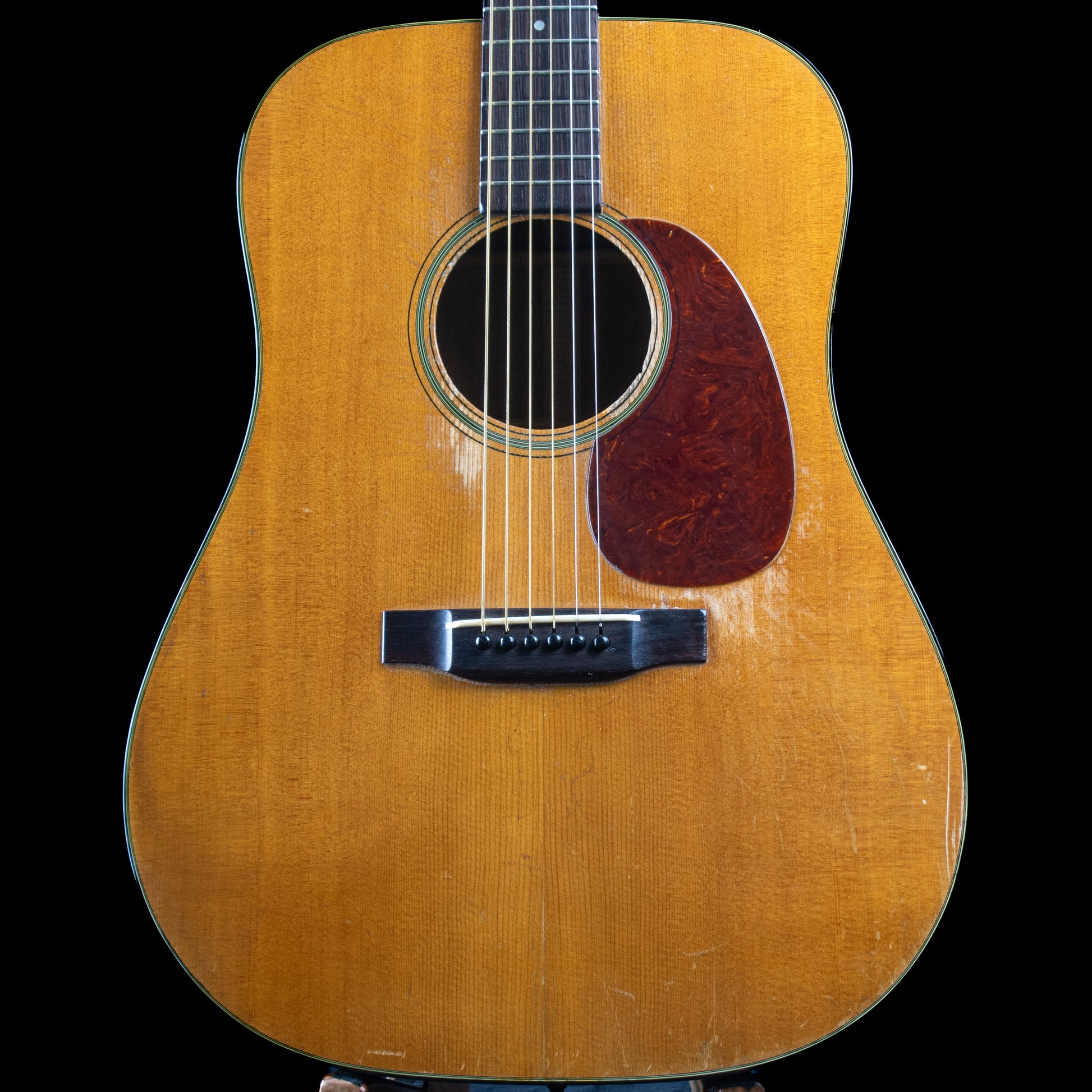 The end result is a gorgeous sounding guitar, with a tone that ranges from the lowlands to snowy peaks. This Martin plays well too, whether you're a flat picker or a finger stylist, you're going to love how this guitar feels in your hands, and how it responds to what you put into it. It has a soft V-shaped neck that is ergonomically pleasing. Aesthetically, this guitar obviously shows some signs of its wear, most notably around the sound hole and tortoiseshell pickguard and a chip on the headstock. Our luthier repaired an issue on the bottom of the guitar near the end pin (final result pictured), he also doweled the holes for the tuners and reinstalled the originals.