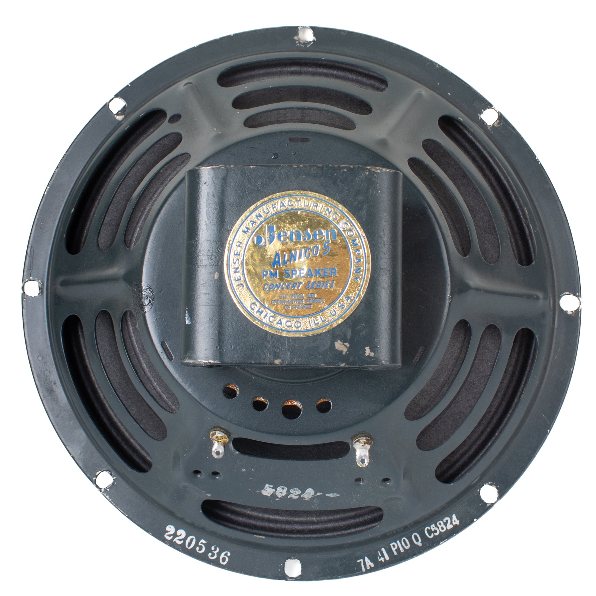 This is one of two EIA-matched P10Qs currently available at GPG. The pair was most likely installed in a Fender Super—the company’s primary 2x10 model at the time—probably the narrow-panel 5E4 version introduced in late 1955. You can find the other P10Q here.