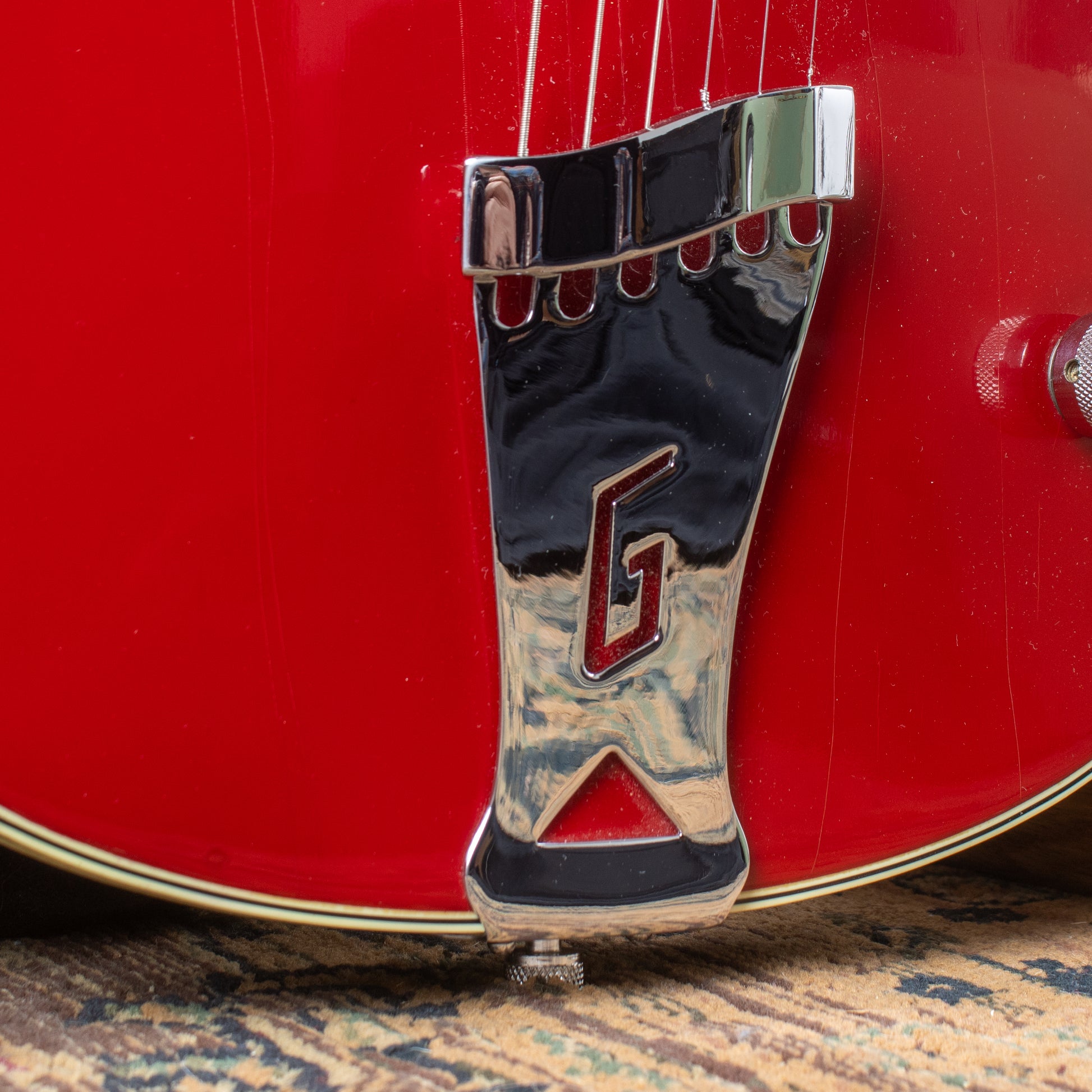 - Hardware: It features chrome hardware, a Space Control bridge and a "G"-logo trapeze tailpiece. The tuners are open-back Grover tuners with butterfly buttons.