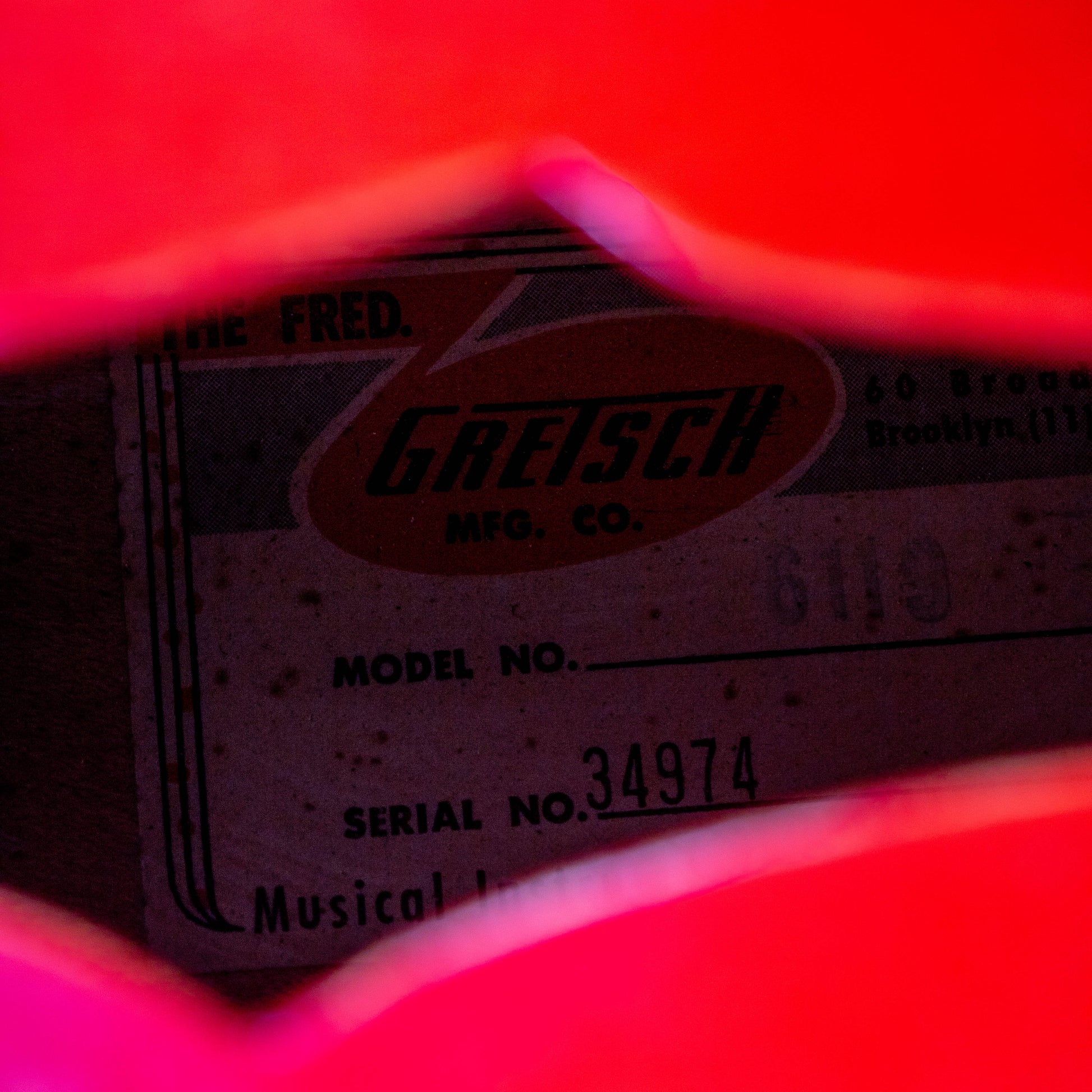 For your consideration, Garrett Park Guitars presents this 1959 Gretsch 6119 Chet Atkins Tennessean, an all-original example of one of Gretsch’s most iconic single-pickup hollowbody models. Built at the height of the company’s golden era, this vintage Tennessean captures everything players love about late-’50s Gretsch craftsmanship — striking looks, lively tone, and impeccable feel.