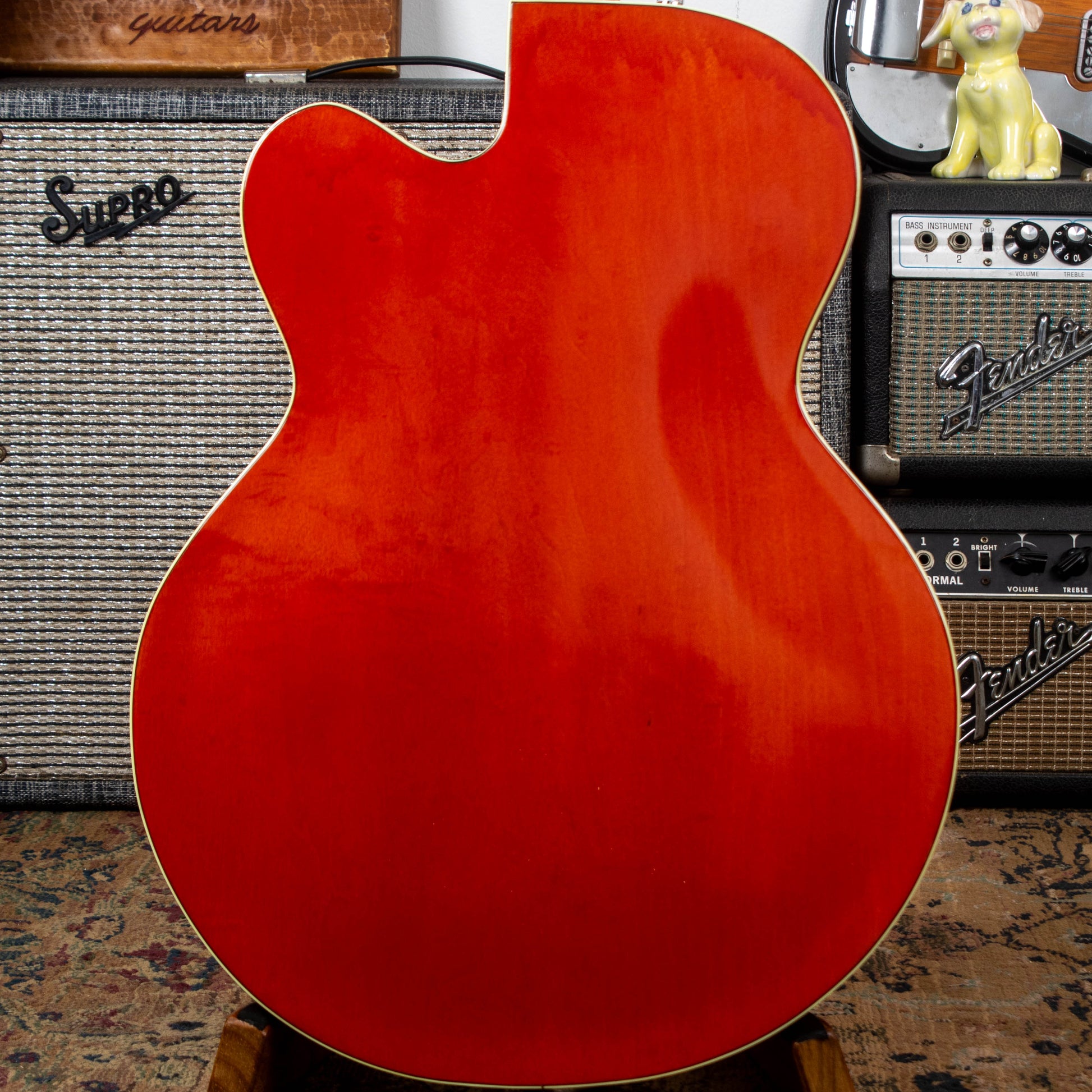 Finished in rich Cherry (Western) Red nitrocellulose lacquer, this guitar’s laminated maple top and back with mahogany sides provide a warm yet articulate tonal foundation. The set mahogany neck with a C-shaped profile and ebony fingerboard offers a smooth, fast-playing surface that feels both solid and responsive in hand. Its original Filter’Tron pickup delivers the unmistakable Gretsch chime — bright, twangy treble with clear, tight bass response that’s perfect for rockabilly, rock ’n’ roll, and vintage country. The filter switch produces warmer, balanced tones ideal for rhythm work and rounded lead lines.