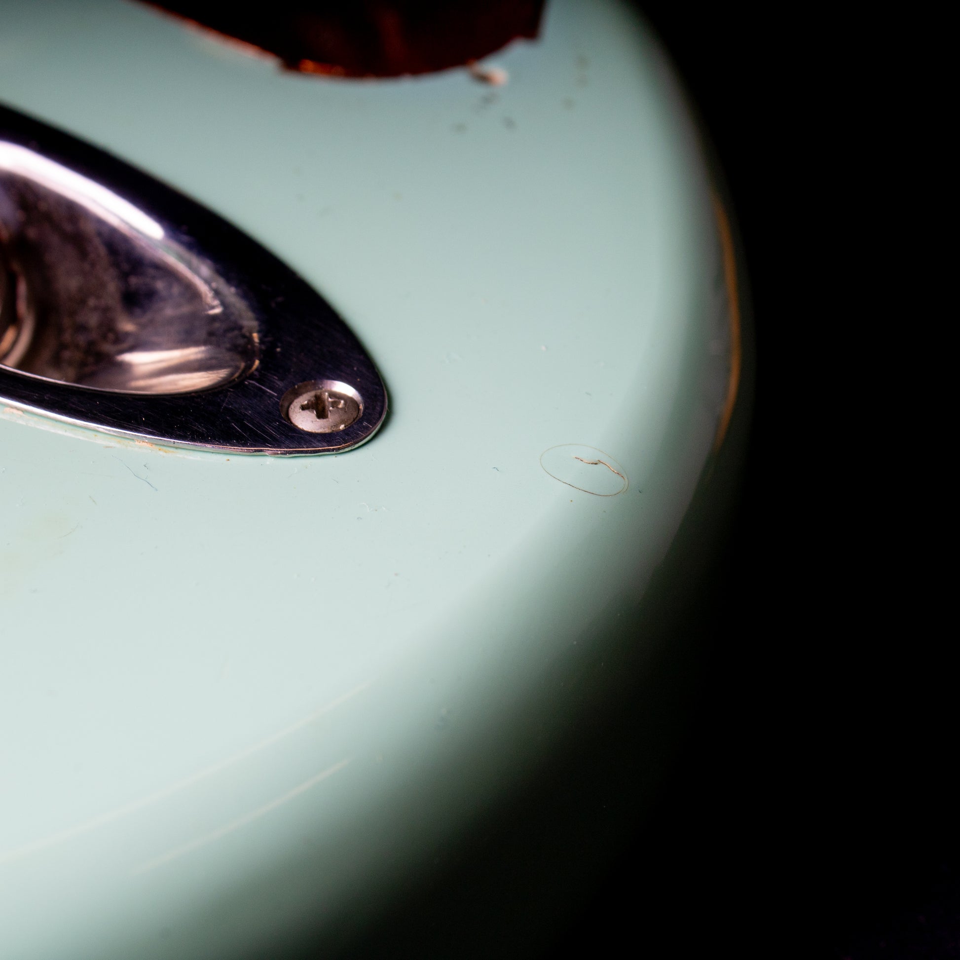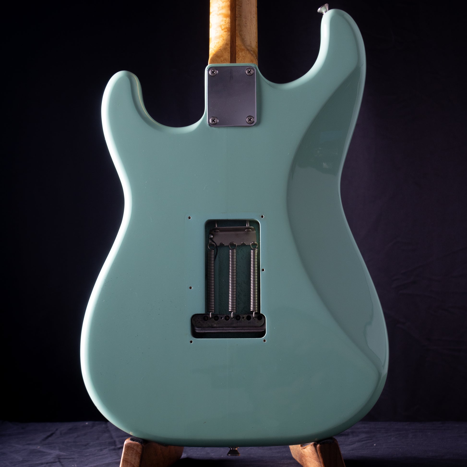 This S-style partscaster channels the understated elegance and clarity of Fender’s 1950s golden era, featuring an aged blue finish (Daphne or Sonic) over an alder body of likely Allparts origin. Paired with a premium Fender Custom Shop bird’s-eye maple neck carved to a comfortable soft V profile, and topped with a single-ply pickguard, the result is a tasteful, vintage-leaning instrument that feels immediately familiar in hand.