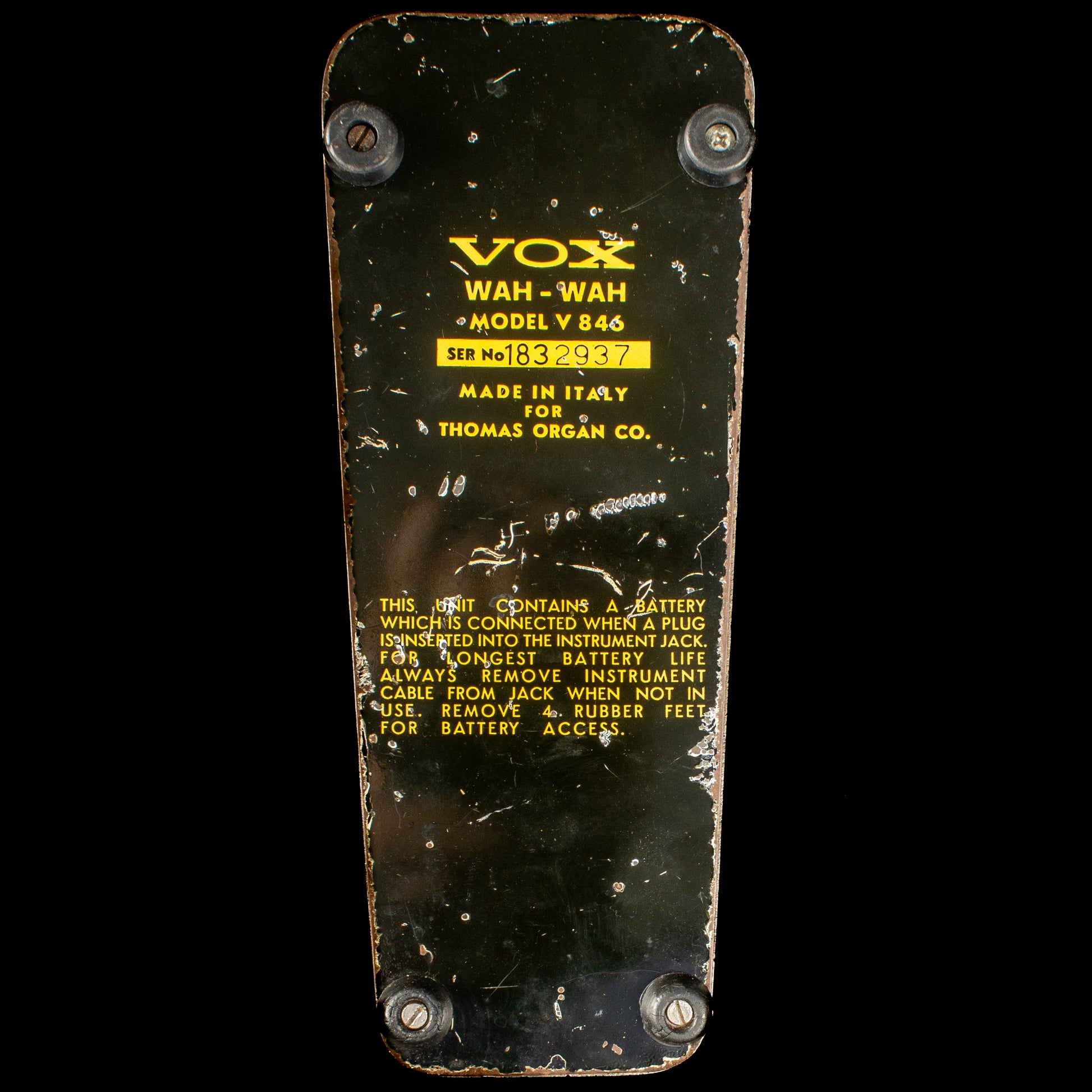 For your consideration, Garrett Park Guitars presents this vintage Vox V846 Wah-Wah, manufactured in Italy for Thomas Organ Co. Few effects pedals are as instantly recognizable—or as historically significant—as the Vox wah, and the V846 sits squarely at the heart of that legacy. Known for its broad, vocal sweep and expressive midrange character, the Italian-made Vox wah became a defining voice of late-’60s and early-’70s rock, shaping the sound of countless players and recordings that followed.